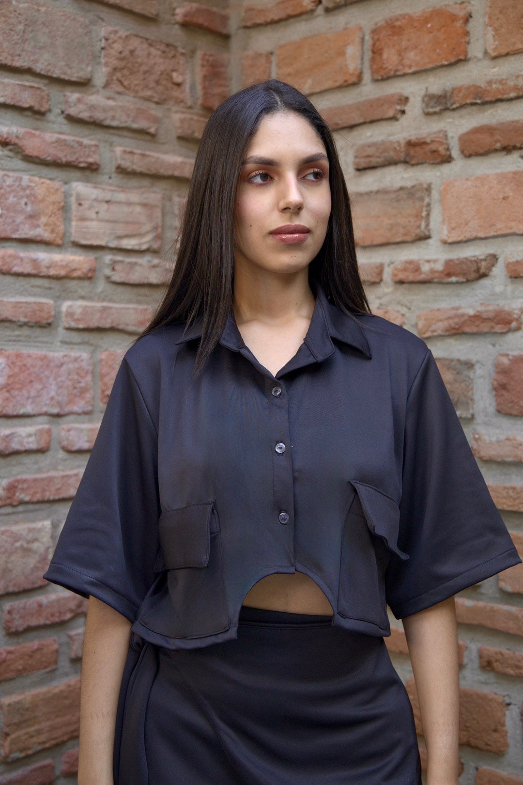 Nuestro Set está compuesto por una blusa con cuello y una falda con un corte en forma de ola y un nudo que ajusta a la cintura para resaltar tu figura. Y una blusa con corte.